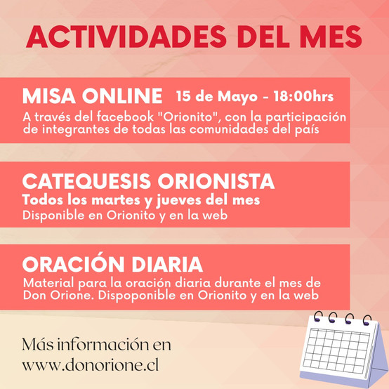 Oración diaria del Mes de Don Orione Pensado principalmente para las comunidades educativas, pero también para todos los demás agentes pastorales y laicos en general que se sienten llamados a vivir su vocación cristiana desde la espiritualidad orionista, pondremos a su disposición desde el 1 de mayo un material con una oración para cada día. Estará disponible para descarga desde este sitio web, y también disponible en el Facebook "Orionito".